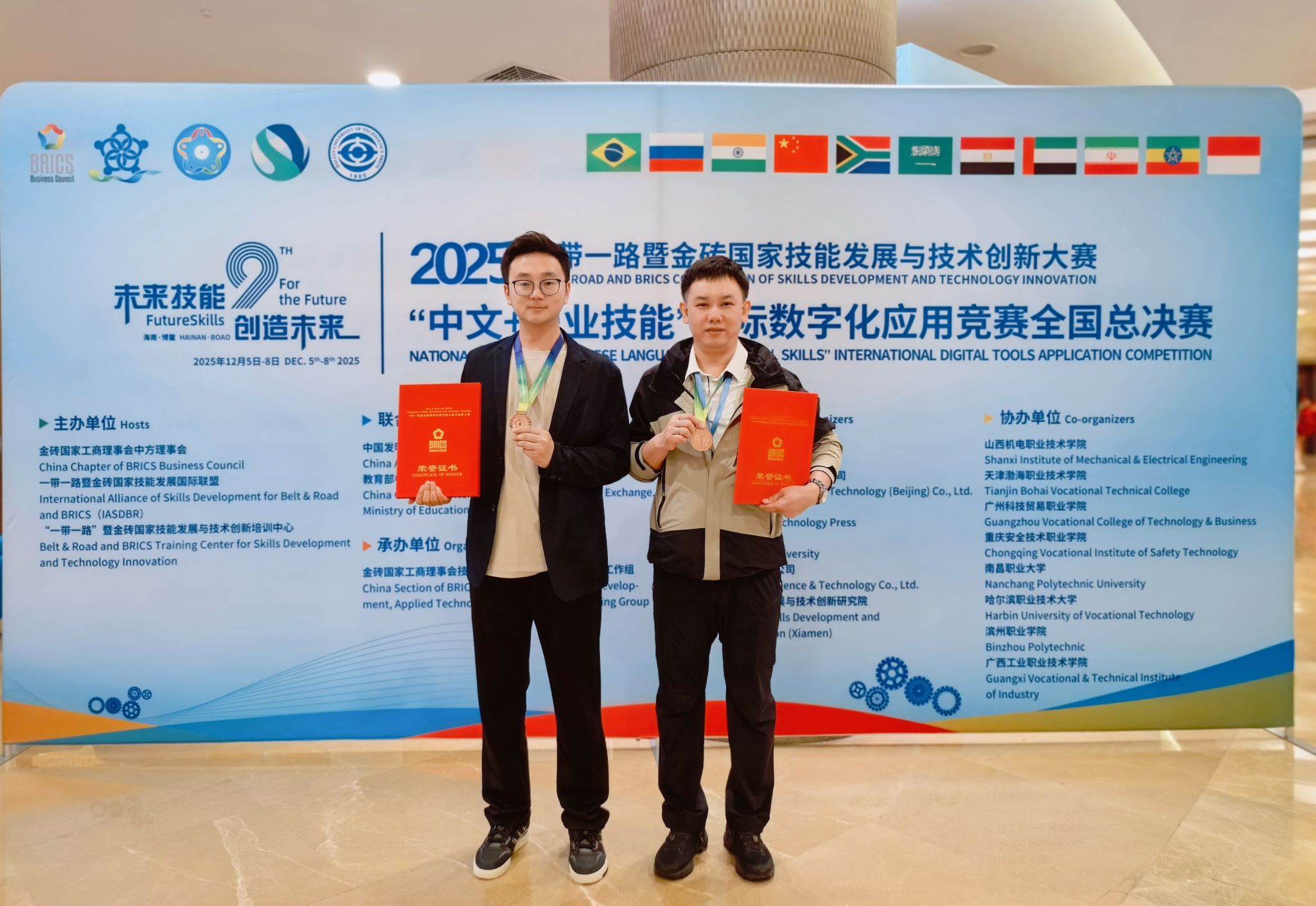 12月7日至8日,2025“一带一路”暨金砖国家技能发展与技术创新大赛“中文+职业技能”国际数字化应用竞赛全国总决赛在海南博鳌亚洲论坛国际会议中心举行。我院机械工程系教师郝赫、张召历经初赛、华北赛区复赛的层层选拔,在全国总决赛中凭借扎实的专业功底、出色的现场表现及中文应用与数字化技能的深度融合能力,双双荣获三等奖。