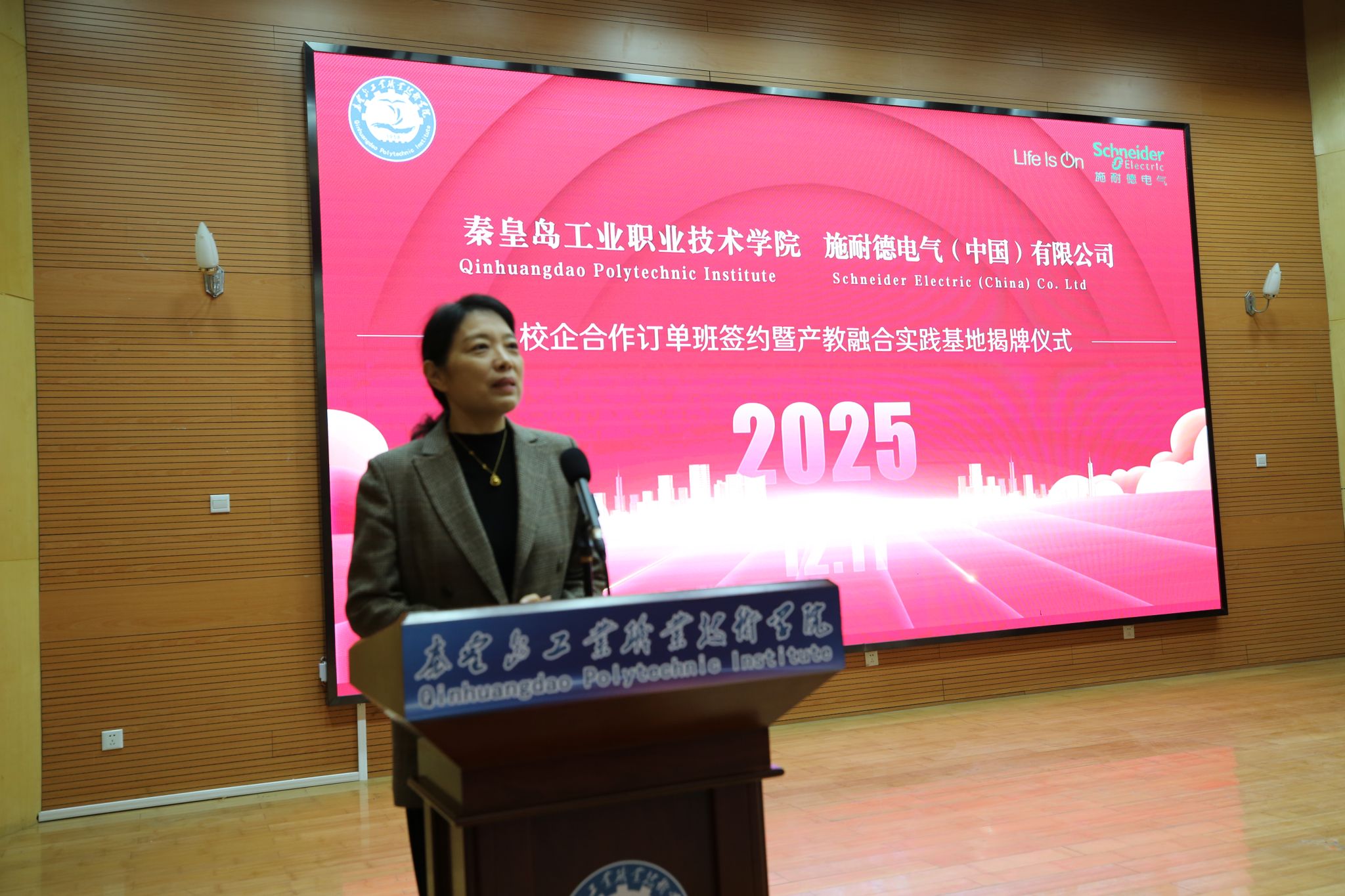 施耐德电气(中国)供应链校企合作总监陈虹致辞,她指出,施耐德电气将充分发挥产业资源与技术优势,推动培养环节提前介入,深度参与订单班课程体系设计、教学大纲制定,把企业岗位标准、行业前沿技术融入日常教学全过程。同时,企业将依托生产基地与实训平台,常态化开展企业现场教学,让学生走进生产一线,在真实的工作场景中提升实操能力,夯实职业发展基础。