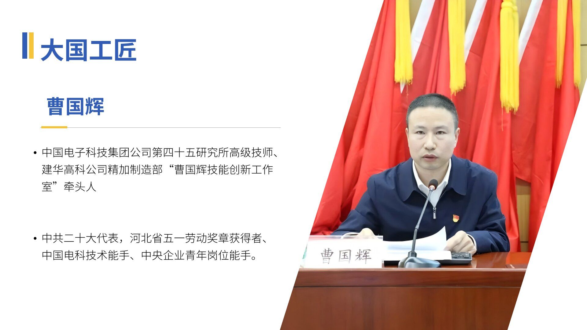 曹国辉同志现任中国电子科技集团第四十五研究所建华高科技术总监,他是精密制造领域中的璀璨传奇,被誉为零件制造的“魔法师”。在十八年的职业生涯中,他从初出茅庐的“新兵”蜕变为能够攻克奥运安保项目、全自动引线键合机关键部件等诸多高精尖难题的“统帅”。积极参与破解半导体核心装备光刻机、CMP抛光机等“卡脖子”技术难题,为国家科技重大专项和国防科技项目的顺利完成做出了积极贡献。中国电子科技集团特别成立了“曹国辉技能创新工作室”,而今年的9.3大阅兵,他更被荣幸地邀请至天安门观礼。