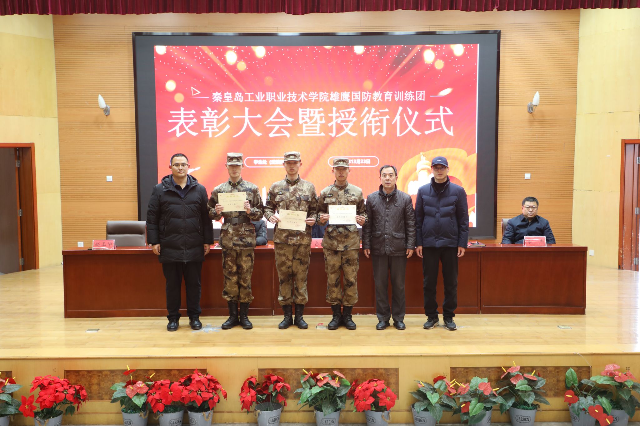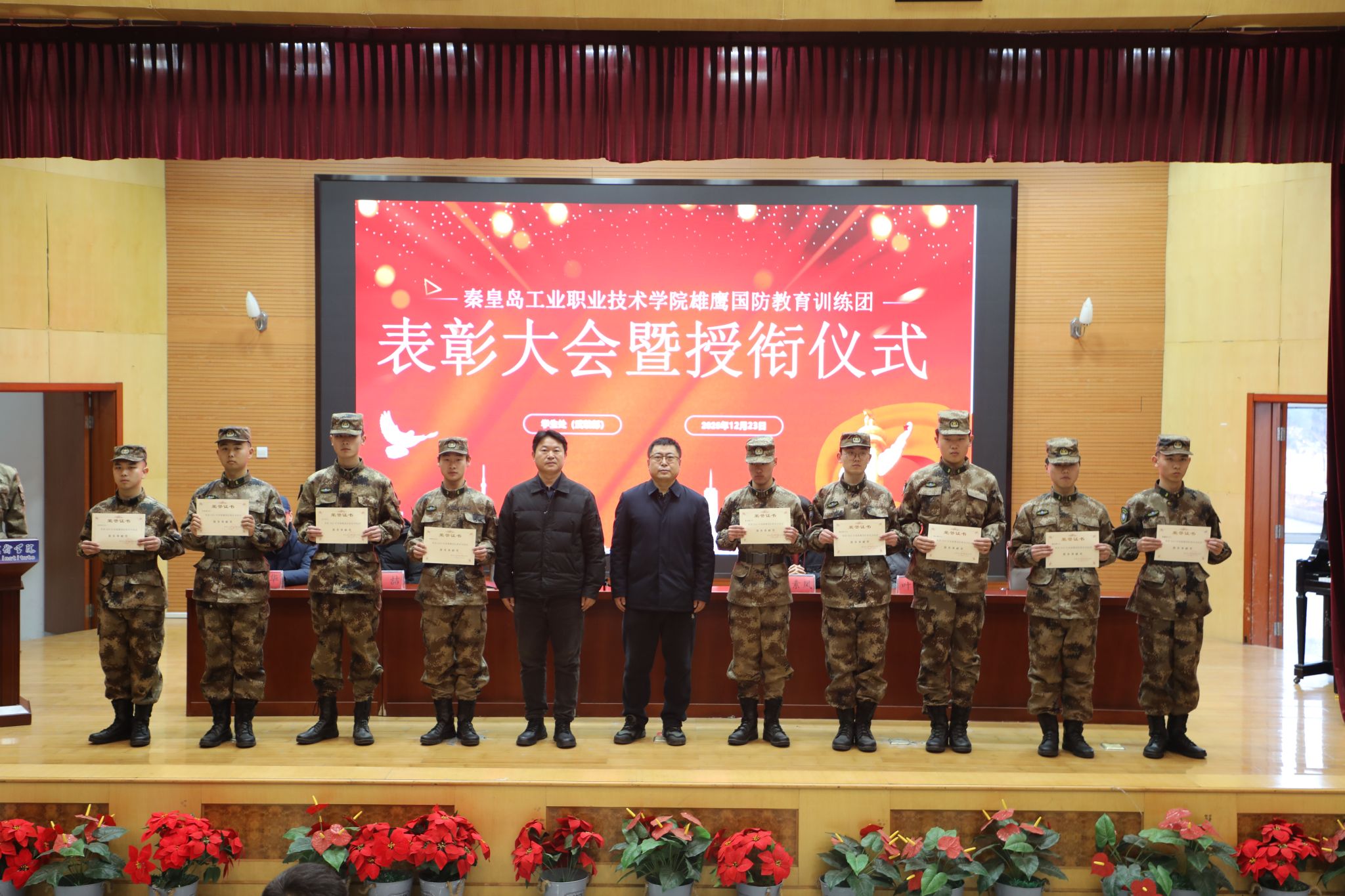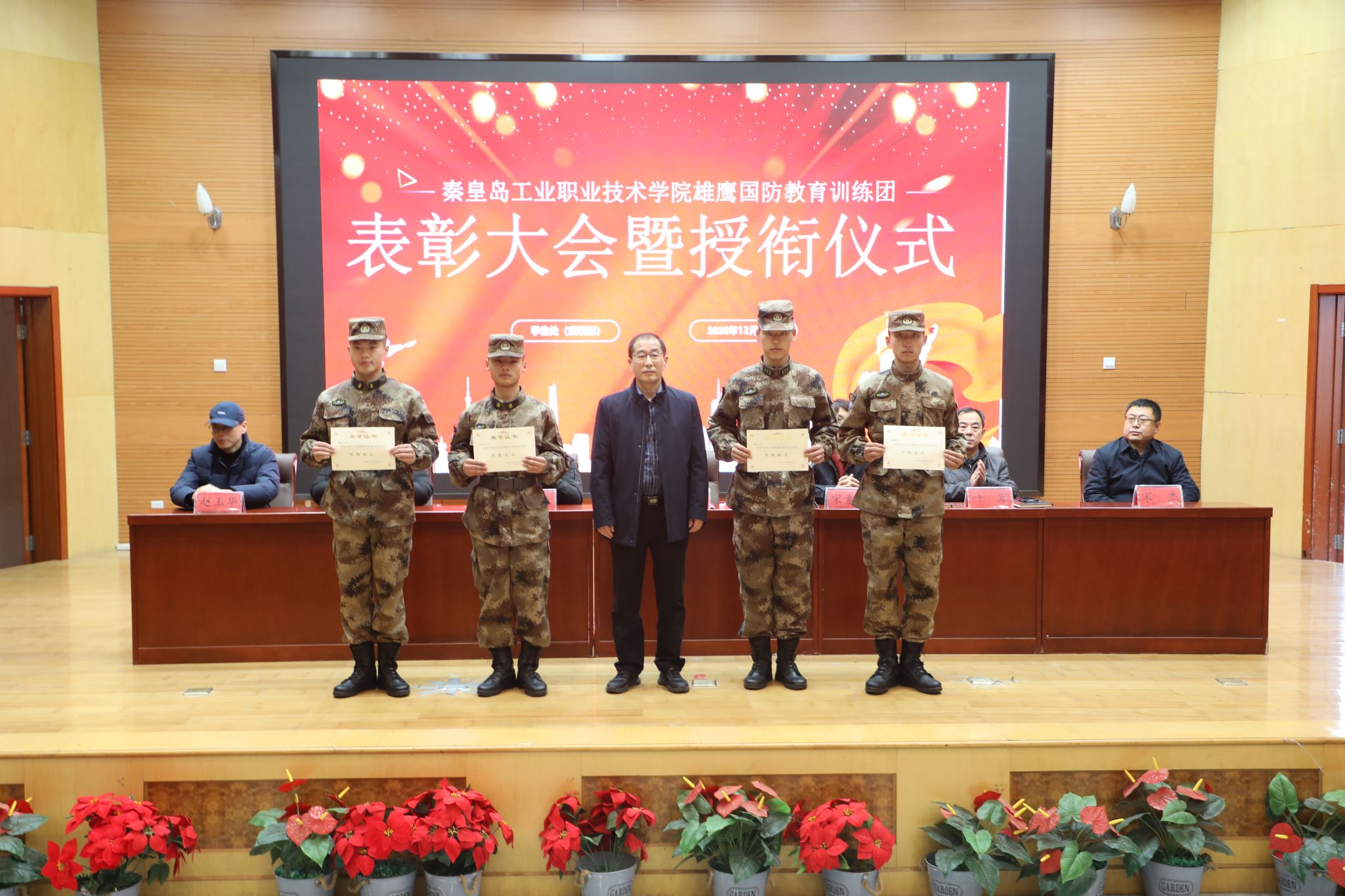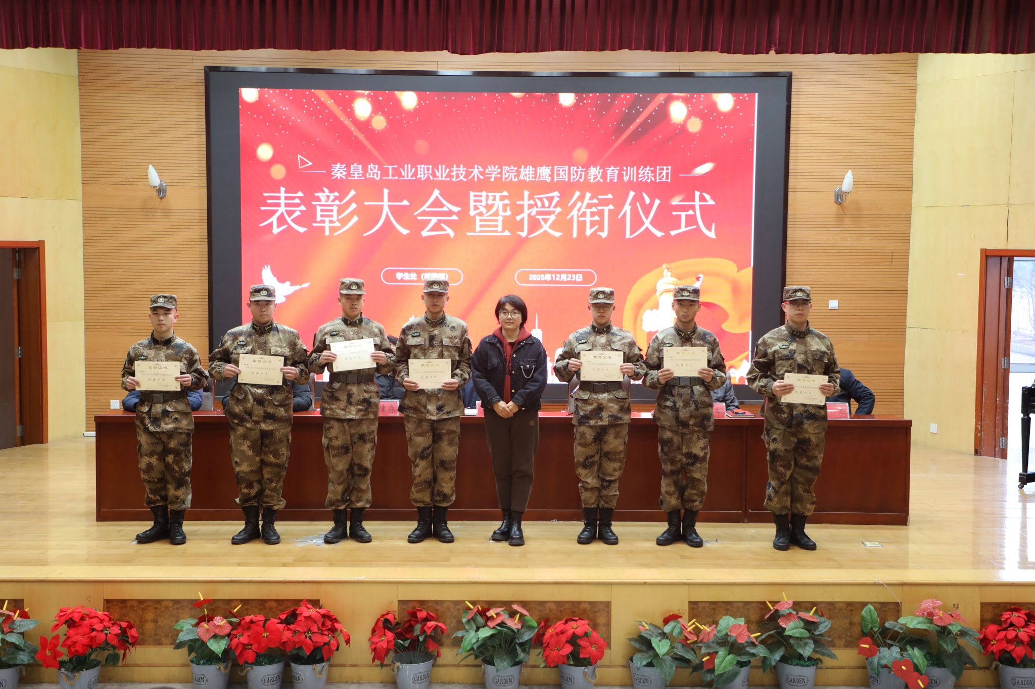 12月23日,学院在图书馆报告厅举行2025年度“雄鹰国防教育训练团”表彰大会暨授衔仪式。王占峰副院长出席大会并讲话,学生处及各系相关负责人、辅导员、雄鹰国防教育训练团全体成员和学生代表参加了大会。