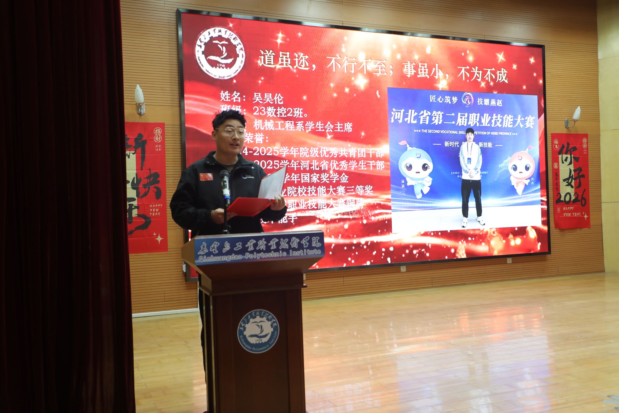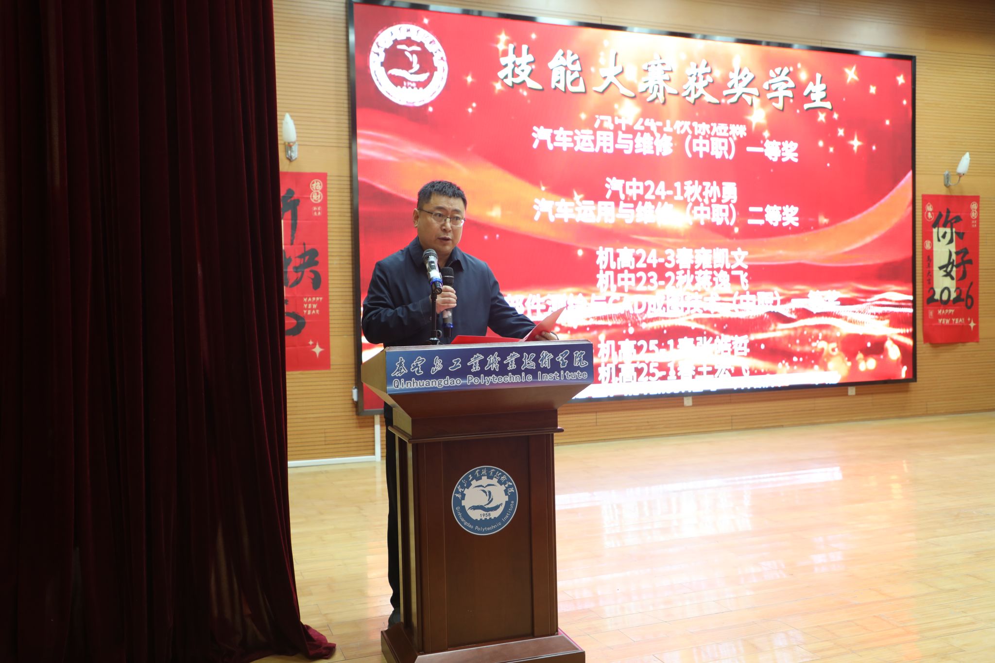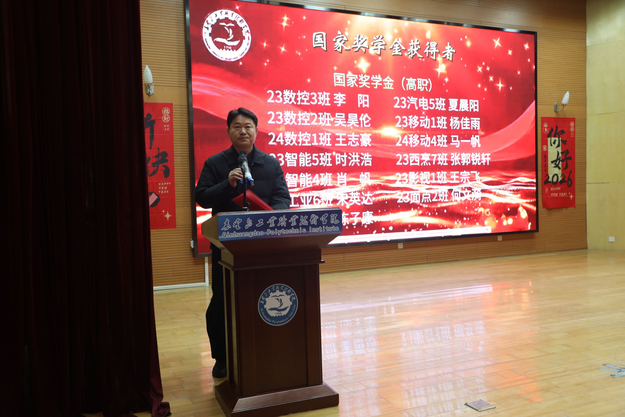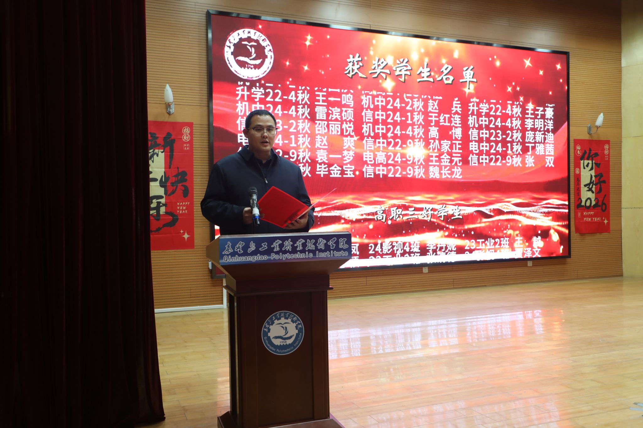 为表彰先进、树立榜样,凝聚奋进力量,1月8日下午,秦皇岛工业职业技术学院在图书馆报告厅举行2025年度优秀学生和先进班集体表彰大会。学院党委副书记、院长张玉强、党委副书记徐明、副院长金辉、纪委书记彭诗勇、副院长王占峰以及相关部门中层干部出席了大会,大会由学生处处长宋素凤主持。