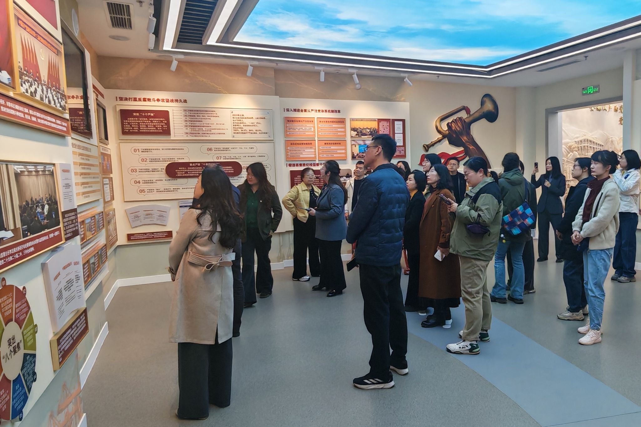 在展厅讲解员的引导下,全体党员有序参观学习。展厅紧扣“全面从严治党永远在路上,党的自我革命永远在路上”的核心主题,通过图文展板、典型案例、多媒体影音等多元形式,全面展现了新时代全面从严治党的伟大实践和丰硕成果,深刻剖析违纪违法典型案例的警示教训,系统阐释党的纪律建设的核心要求。党员教师们认真聆听、细致观摩、深入思考,在实景案例中受警醒、明底线、知敬畏,进一步强化以思政引领专业、以纪律规范教学的思想自觉与行动自觉。