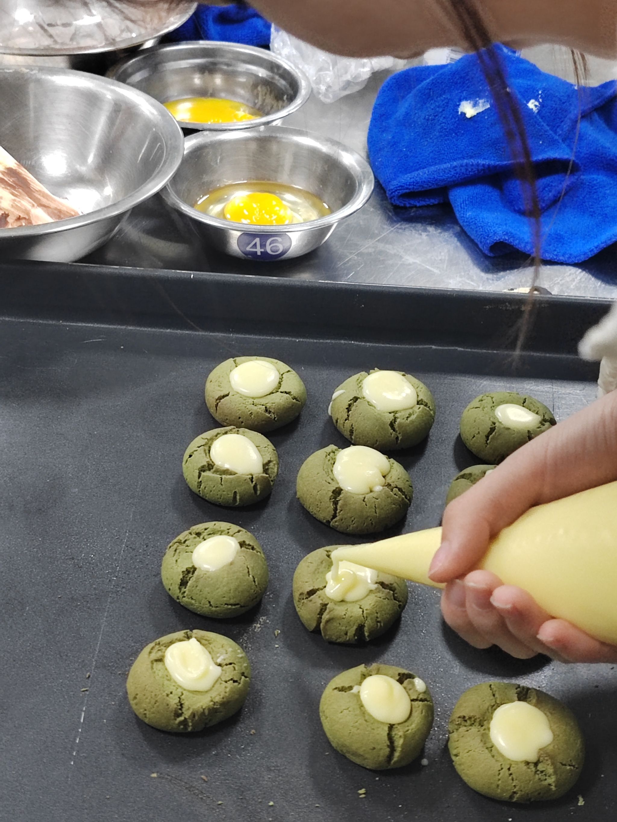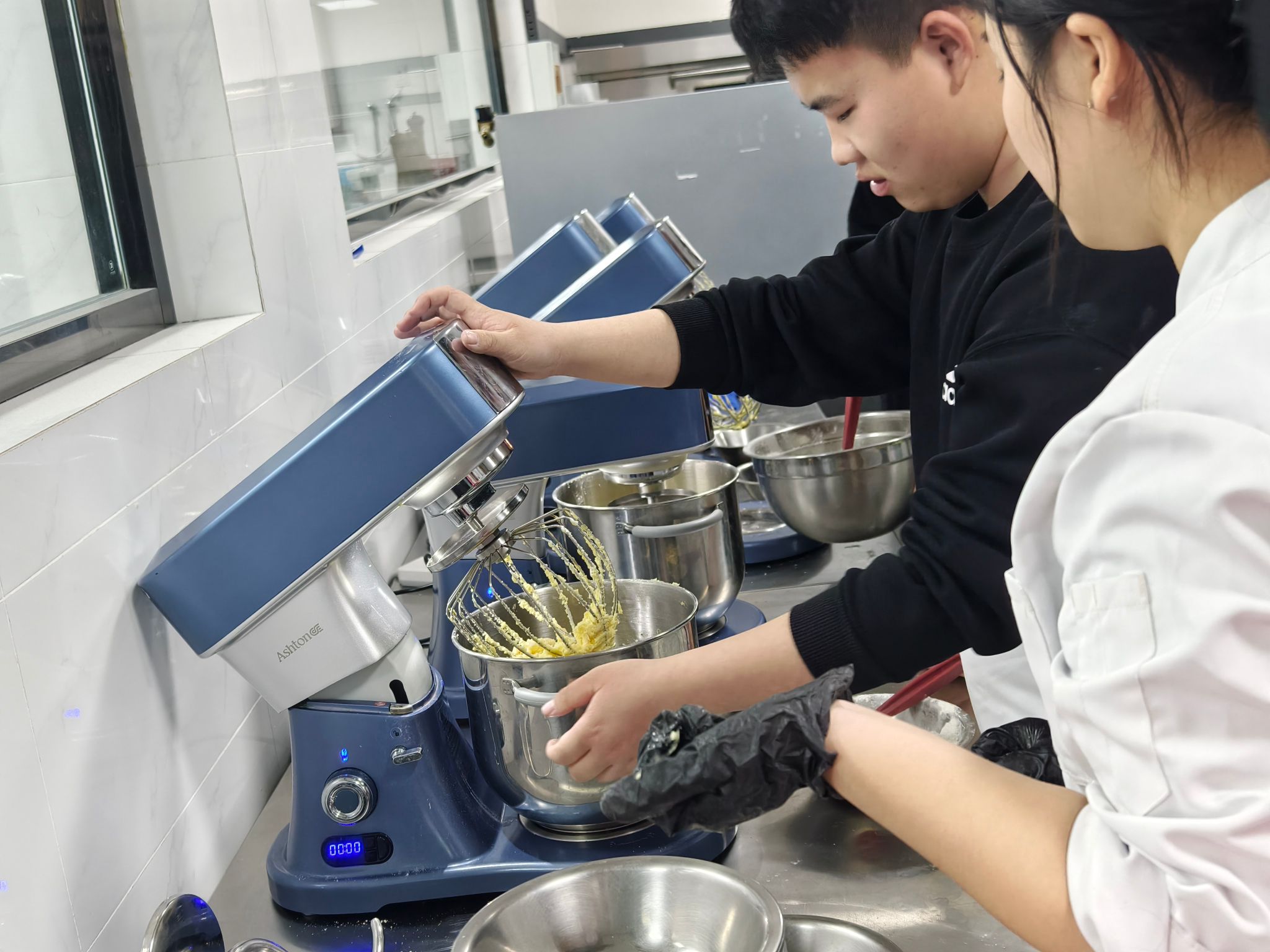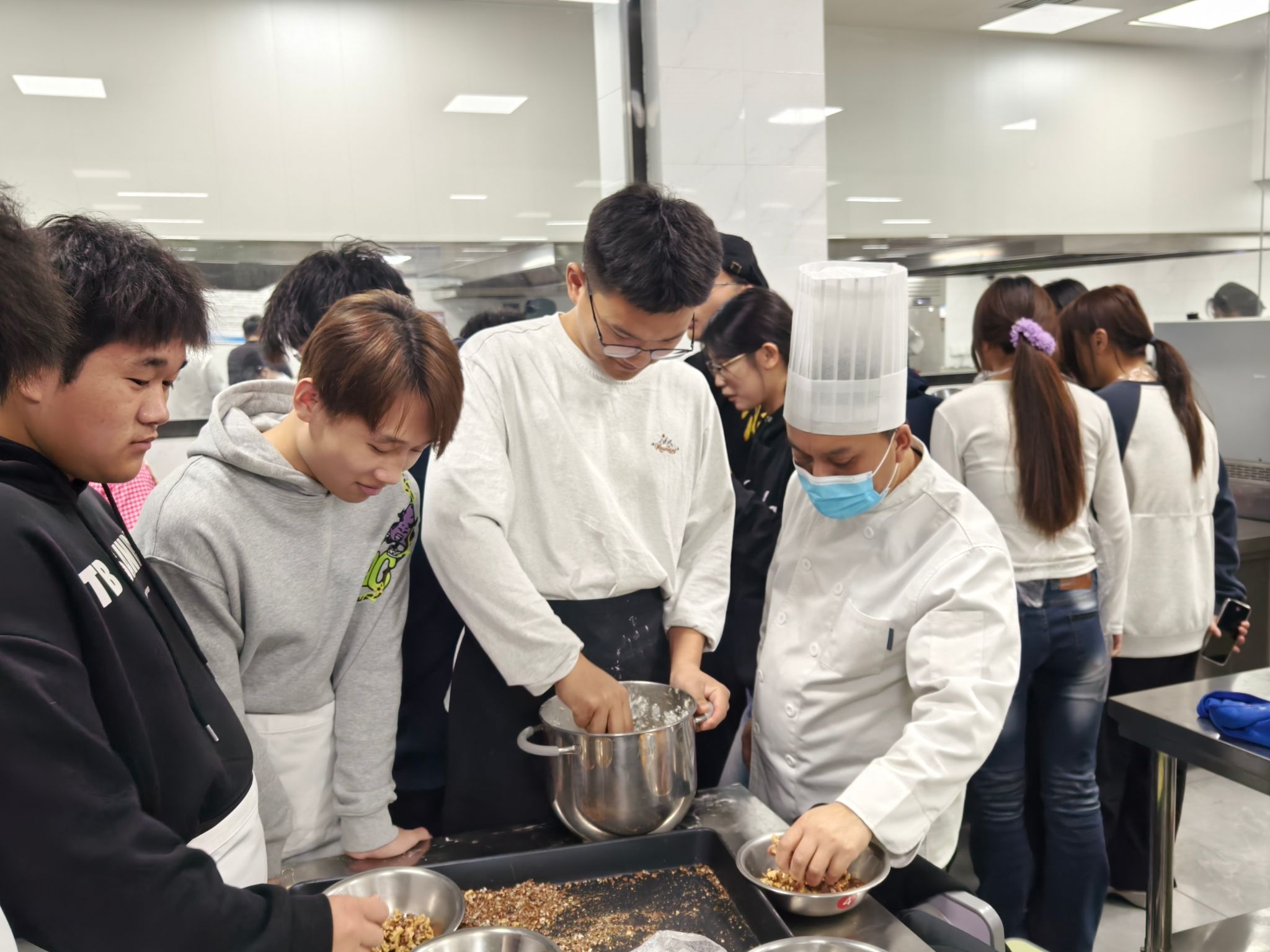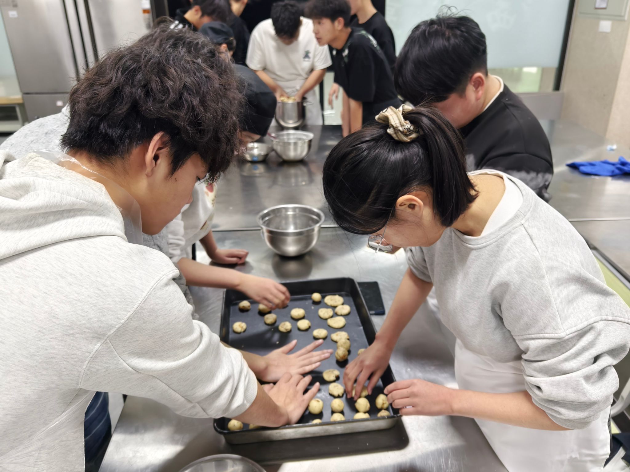 “黄油要打发到蓬松状态,面粉筛完更容易融合~”中西面点专业常春雨老师化身“甜蜜导师”,手把手教学核桃曲奇、抹茶白巧克力曲奇、可可曲奇3款限定点心。从原料称重到烘焙温度,每个操作难点都逐一拆解,6组跨系小分队分工明确:称重、搅拌、塑形、装盘,原本不熟悉的同学因为共同的任务快速熟络,揉面时的默契配合、等待出炉时的集体期待,让实训室里满是欢声笑语~