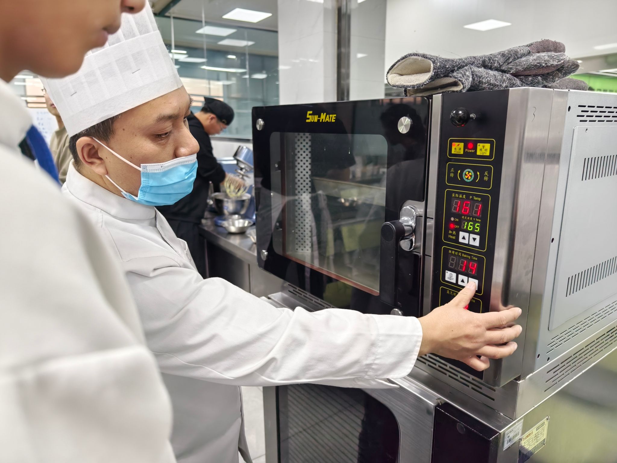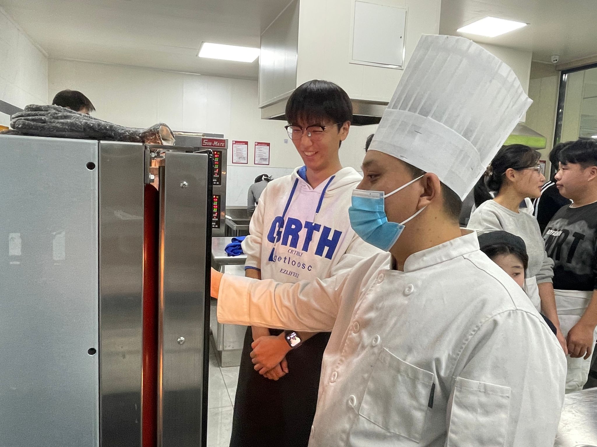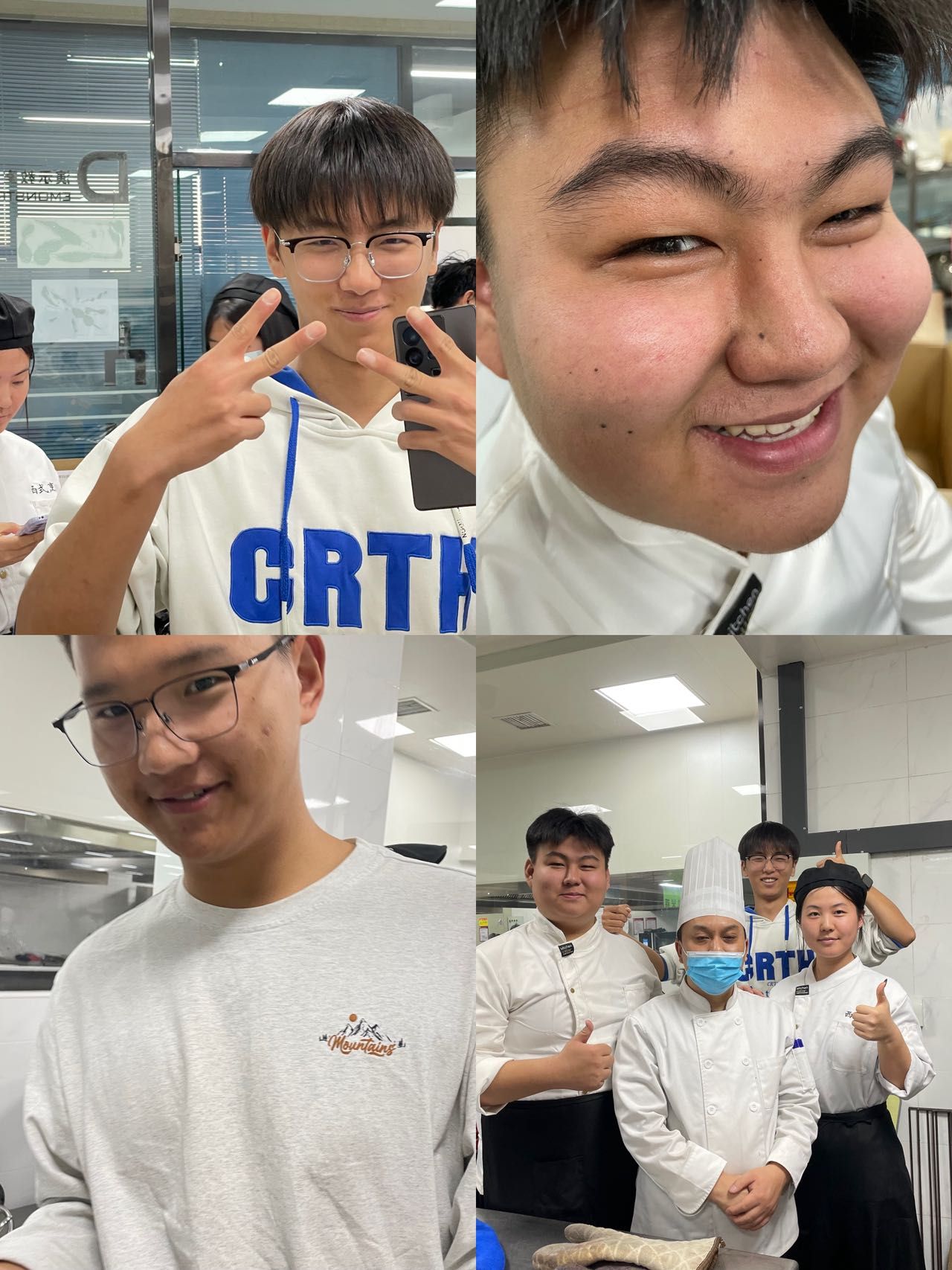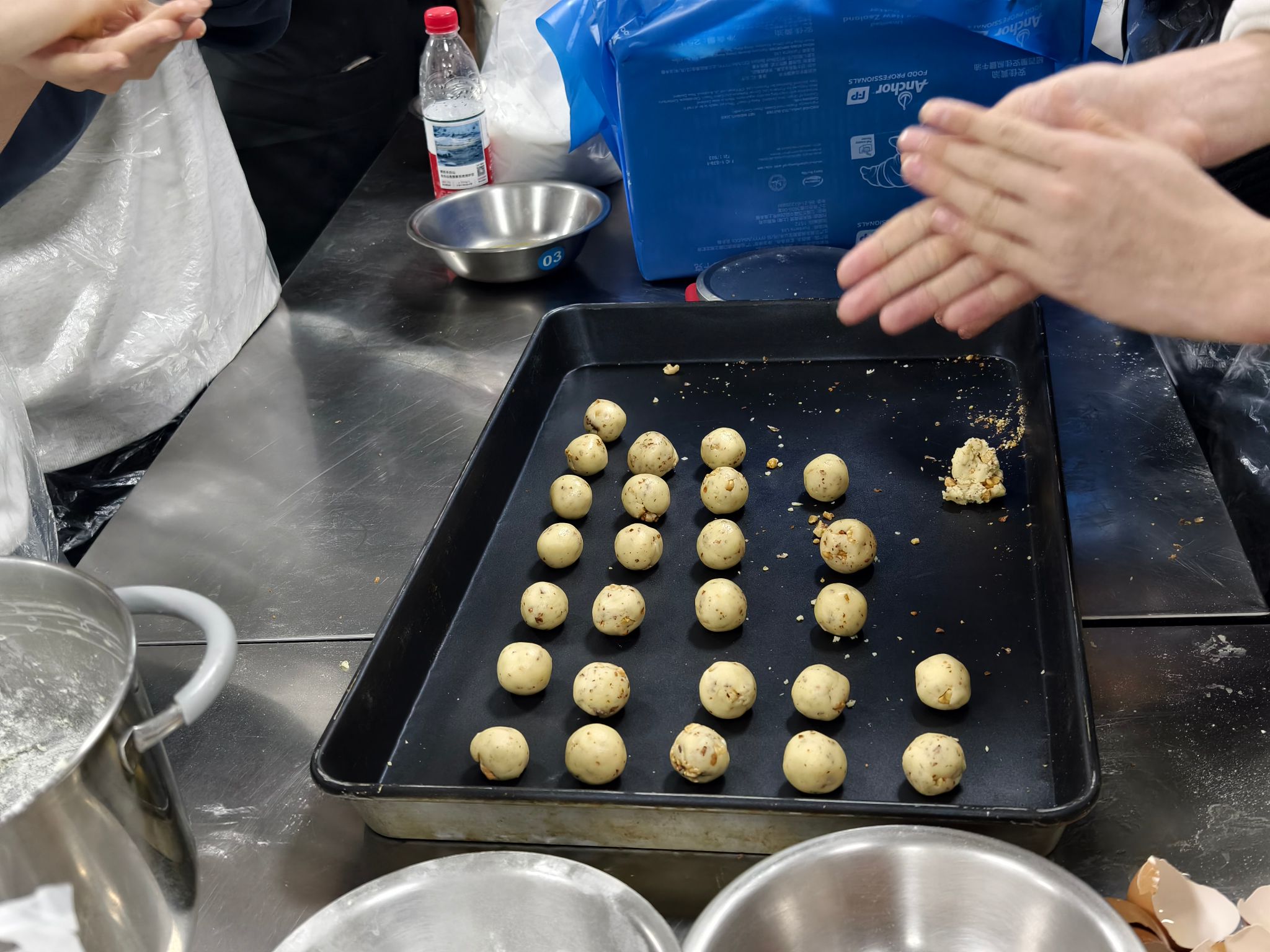 “黄油要打发到蓬松状态,面粉筛完更容易融合~”中西面点专业常春雨老师化身“甜蜜导师”,手把手教学核桃曲奇、抹茶白巧克力曲奇、可可曲奇3款限定点心。从原料称重到烘焙温度,每个操作难点都逐一拆解,6组跨系小分队分工明确:称重、搅拌、塑形、装盘,原本不熟悉的同学因为共同的任务快速熟络,揉面时的默契配合、等待出炉时的集体期待,让实训室里满是欢声笑语~